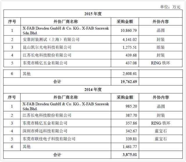 在具体的指纹芯片成本构成中,2015年度较2014年度组装成本大幅下降,外协原材料成本及封装成本有所上升。这主要是由于2015年下半年起,汇顶指纹芯片系列产品由销售模组为主转为销售芯片为主。汇顶主要向X-FAB Sarawak Sdn.Bhd.、X-FAB Dresden GmbH & Co. KG采购订制晶圆,向精亿五金有限公司、舜远科技有限公司等采购蓝宝石相关制品,然后委托江苏长电科技股份有限公司、昆山凯尔光电科技有限公司、安靠封装测试(上海)有限公司等对检测合格的晶圆进行封装与组装,最后再发往华天科技(西安)有限公司、华天科技(昆山)电子有限公司对芯片进行Trench工艺并测试。报告期内,公司指纹识别芯片前五大外协厂商及其外协内容和金额如下表所示: