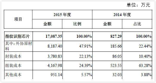 从汇顶自身的因素来说,指纹识别芯片是汇顶于2014年四季度推出的新产品。由于指纹识别技术在手机、平板等移动终端领域还是一项非常新的技术,在当时尚无成熟模组配套供应链体系。为满足客户的交付要求并对客户的量产交付时间及质量直接负责,汇顶采取了委外加工模组并交付指纹模组给客户的业务模式。由于芯片在模组的成本结构中占比较低而且首批模组量产良率尚有待提高,因此毛利率较低。2014年指纹识别芯片的平均单价为61.09元,单位成本为52.21元,毛利率只有14.51%。