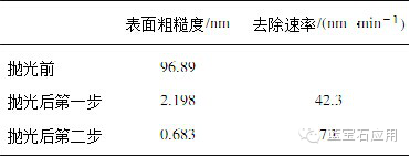 中科院微系统研究所的Zhang等对LED蓝宝石衬底表面加工提出采用不同磨料进行抛光,粗抛采用氧化铝磨料,以快速去除蓝宝石基片的表面缺陷,获得一定的全局平整性。精抛采用较小、较软的氧化硅磨料,获得精细的局部平整化效果(见表1)。这种抛光方法在保证抛光质量的基础上,提高了抛光速率,缩短了抛光时间。