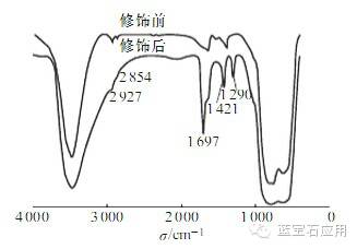 偶联剂是目前应用最广泛的表面改性剂,其中硅烷偶联剂最具代表性,对表面有羟基的无机离子最为有效。硅烷偶联剂对纳米氧化铝的表面改性作用明显,合肥工业大学的薛茹君用硅烷偶联剂KH570在乙醇溶剂中以草酸溶液为催化剂进行水解后对纳米氧化铝进行湿法表面修饰改性,修饰后特征峰强度增强(见图1),表明偶联剂与氧化铝表面发生了较强的化学作用。实验测定结果表明,改性纳米氧化铝在有机相中的分散性和稳定性均得到了改善。